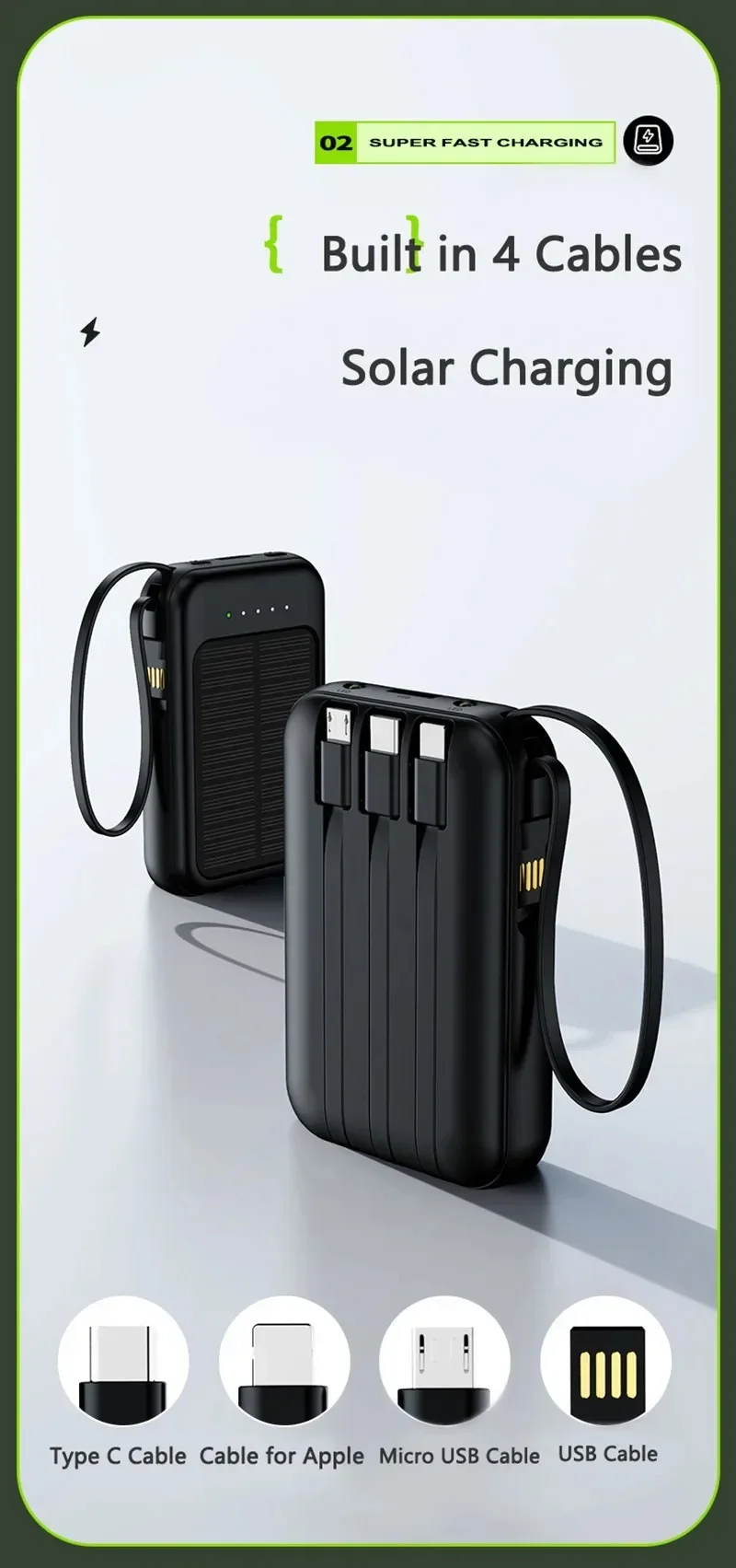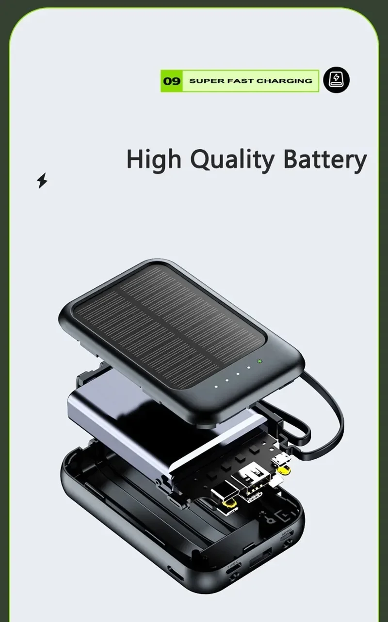 50000mAh Solar Power Bank Built Cables Fast Charger 2 USB Ports External Charger Power Bank LED Light For Iphone Xiaomi Samsung